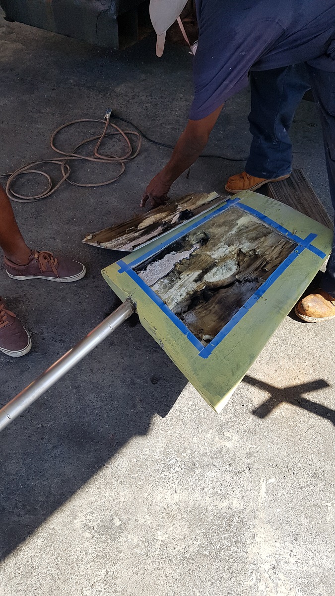The state of the interior of the rudders before repairs. Water got in and started rotting everything away.