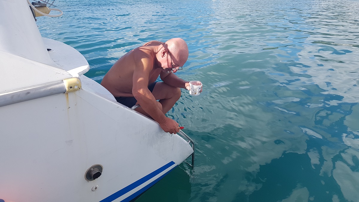 Day after the dinghy theft. Bussi valiantly trying to repair some minor hull damage whilst Michael is out trying to find a replacement dinghy.