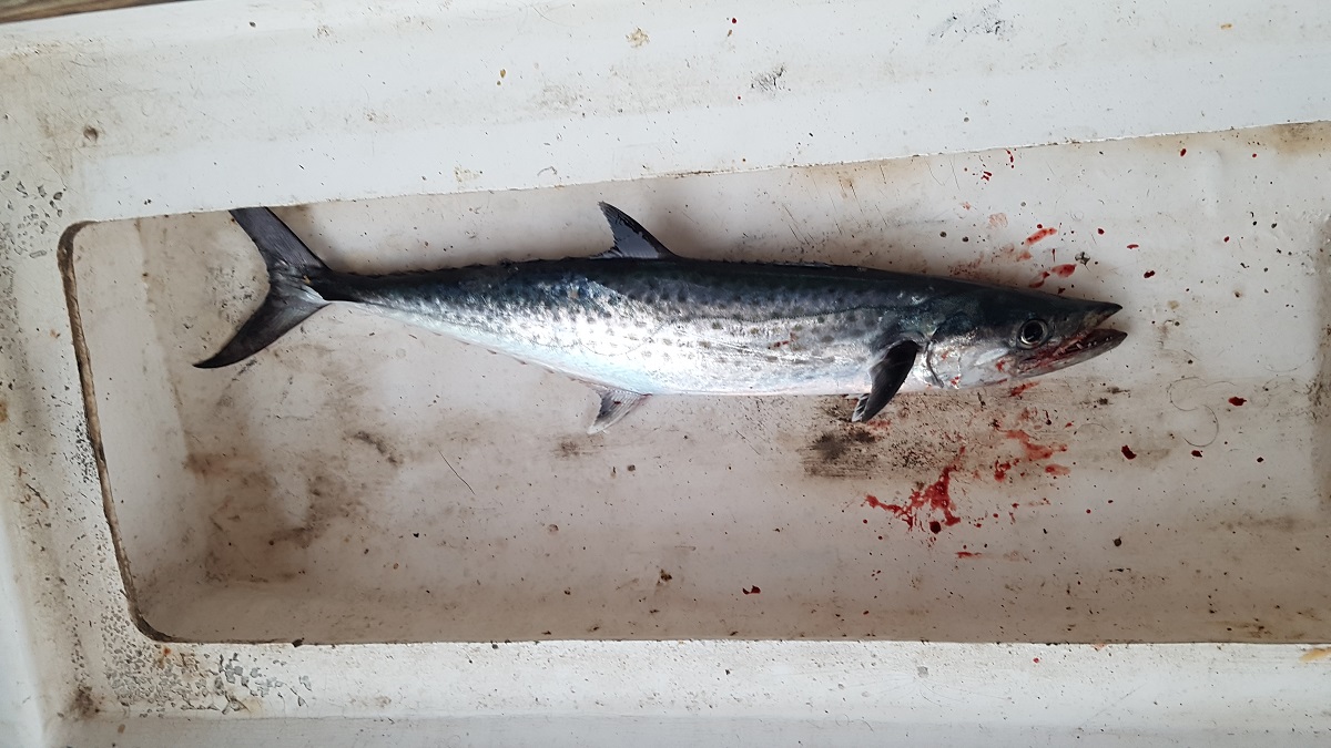 Our first catch on the rod. A nice and tasty little Mackerel.